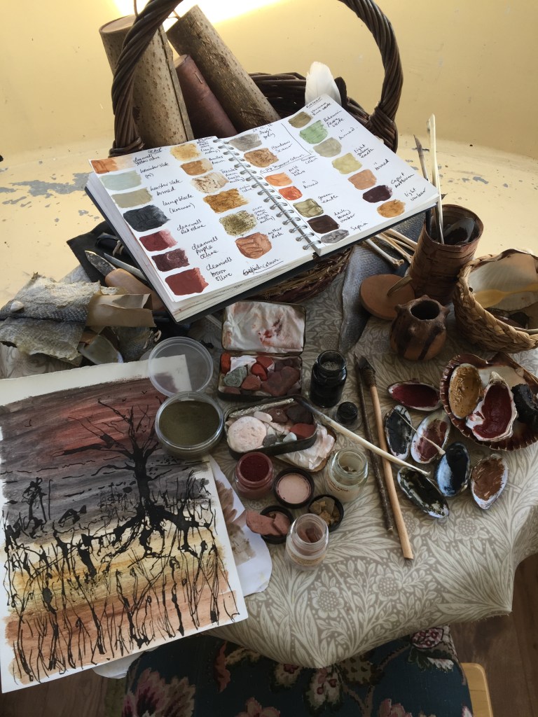 For some years now I have been re-skilling and re-wilding. In other words: learning lots of essential things via making, taking courses, reading, experimenting. Although I trained for many years in art, there was almost no mention of the craft of making art, let alone any instruction, except during a superb foundation course (two years spent in Mary Shelley’s son’s house on the Bournemouth cliff top). The last 10 years of concertedly studying bush craft, ancient technologies, earth skills, early and pre-renaissance art techniques and immersing myself in drawing, have seen all these come together and find some way to meld. It was at a Dark Mountain festival Base Camp, in September 2016, where I brought my basket of wild materials along for the first time, that I could appreciate the warm reception these strange items provoked in others.