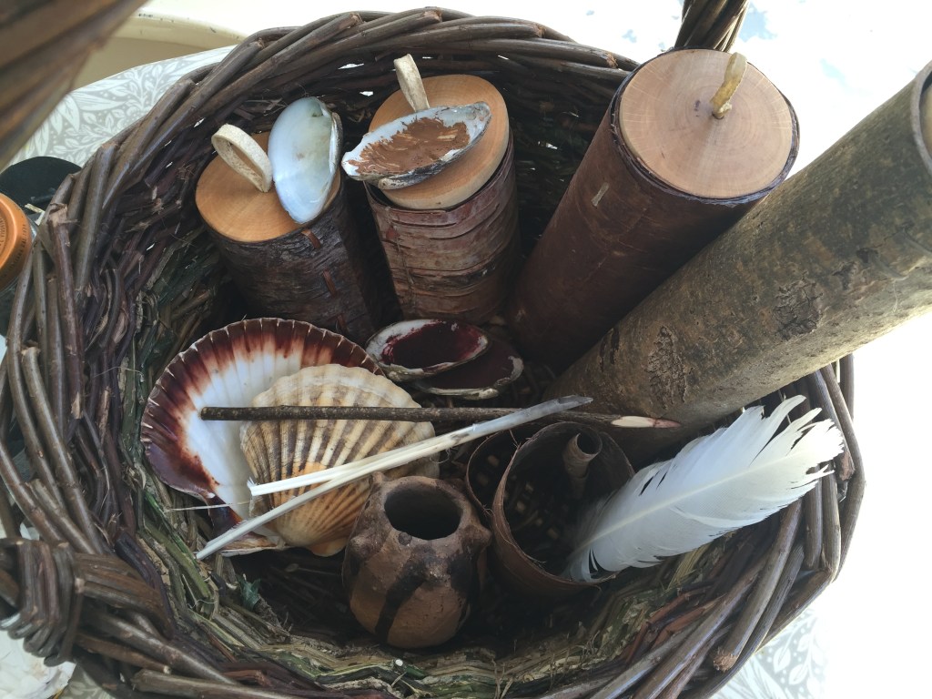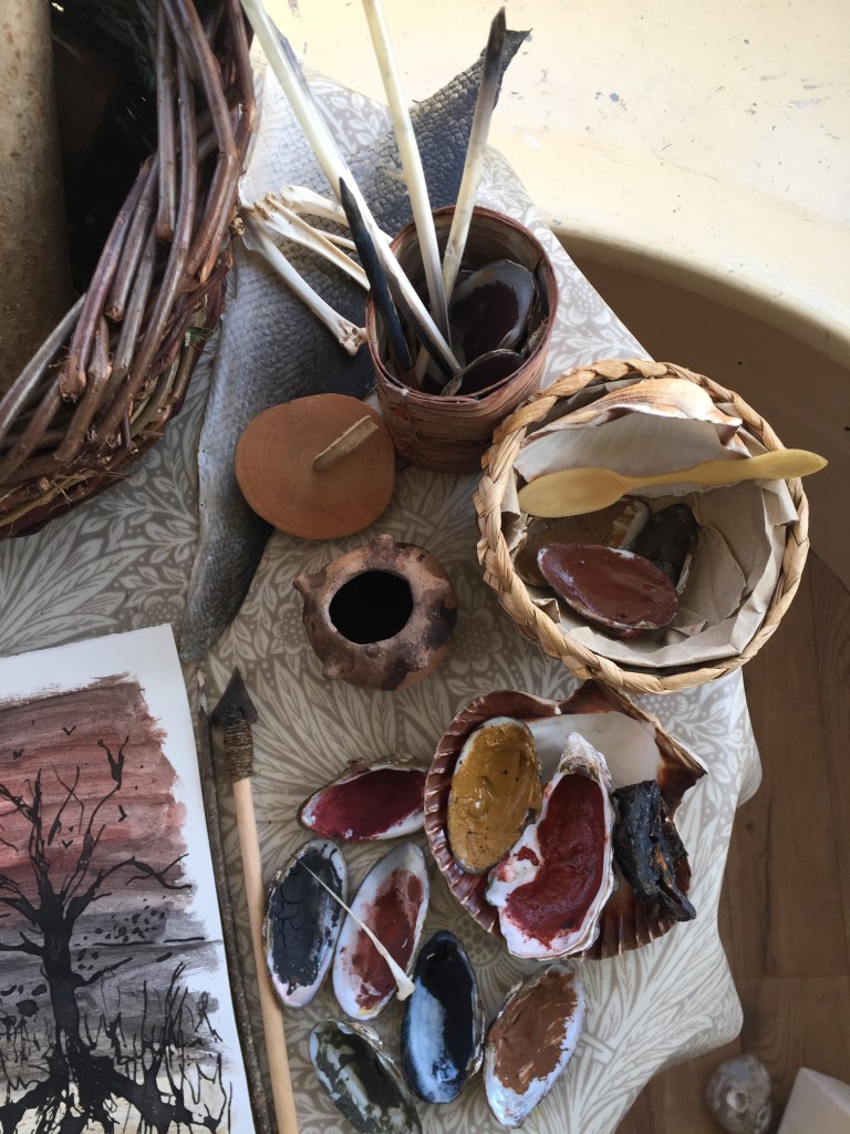 For some years now I have been re-skilling and re-wilding. In other words: learning lots of essential things via making, taking courses, reading, experimenting. Although I trained for many years in art, there was almost no mention of the craft of making art, let alone any instruction, except during a superb foundation course (two years spent in Mary Shelley’s son’s house on the Bournemouth cliff top). The last five years of concertedly studying bush craft, ancient technologies, earth skills, early and pre-renaissance art techniques and immersing myself in drawing, have seen all these come together and find some way to meld. It was at a Dark Mountain festival Base Camp, in September 2016, where I brought my basket of wild materials along for the first time, that I could appreciate the warm reception these strange items provoked in others.
